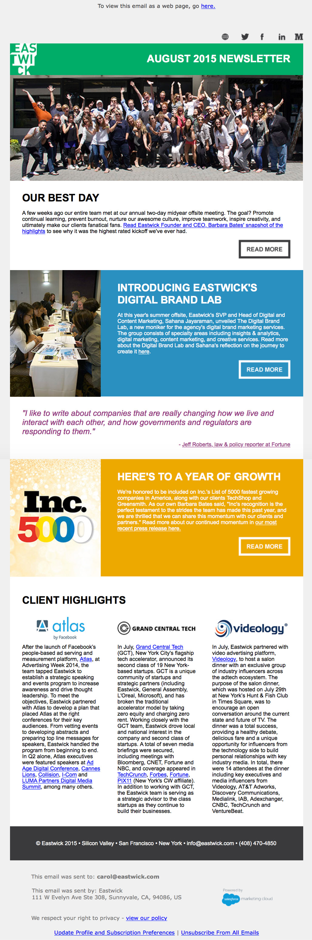 After unveiling the new brand in February 2015, the agency saw a strong increase in press coverage, website traffic, social channel engagement and inbound client inquiries, plus won multiple industry awards including the Silver Stevie Award for Best Public Relations Agency of the Year from the American Business Awards, Tech Agency of the Year from the Holmes Report, Agency of the Year from the Business Intelligence Group, and named to Inc.’s List of 5000 fastest growing companies in America. Eastwick Communications was then acquired by Hotwire in 2016.